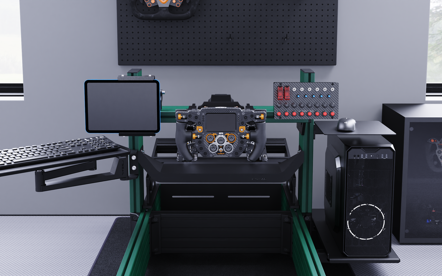 Our dedicated Front Mount wheelbase support (mounting points on the front side of the wheelbase) provides Ultimate Stability as well as Linear, Tilt, and Height adjustment in seconds. Support any High-End front mount wheelbase on the market, including Simucube, VRS, other MiGE Motor-type wheelbases, etc.… Quick Forward-Backwards adjustment via four bolts (most cockpits require moving the whole assembly, including the on-chassis monitor stand, only to be able to adjust the wheelbase position). The assembly comprises thick Laser Cut carbon steel and a matte black powder coat finish. Zero-Flex guaranteed!