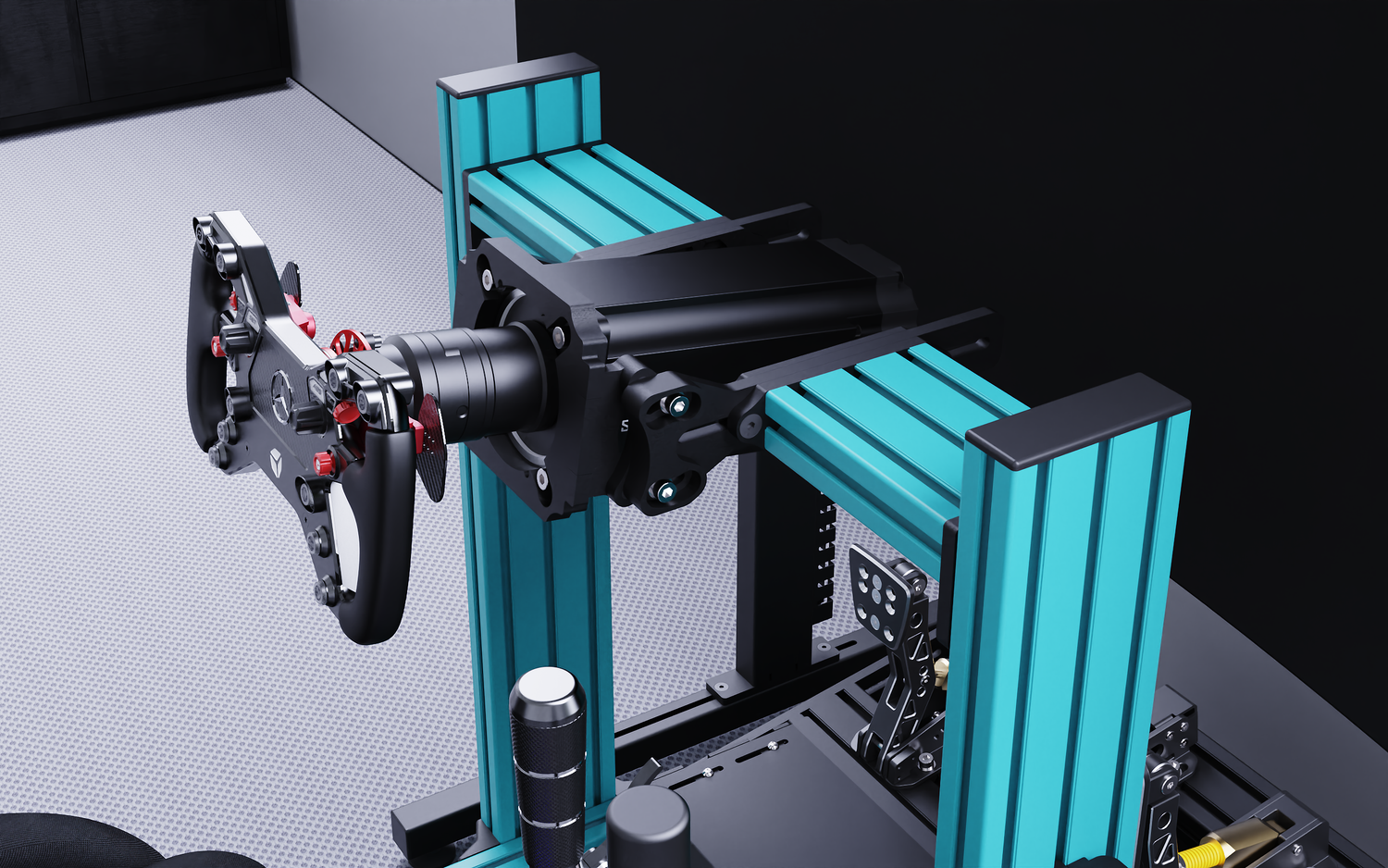 Our dedicated Front Mount wheelbase support (mounting points on the front side of the wheelbase) provides Ultimate Stability as well as Linear, Tilt, and Height adjustment in seconds. Support any High-End front mount wheelbase on the market, including Simucube, VRS, other MiGE Motor-type wheelbases, etc.… Quick Forward-Backwards adjustment via four bolts (most cockpits require moving the whole assembly, including the on-chassis monitor stand, only to be able to adjust the wheelbase position). The assembly comprises thick Laser Cut carbon steel and a matte black powder coat finish. Zero-Flex guaranteed!