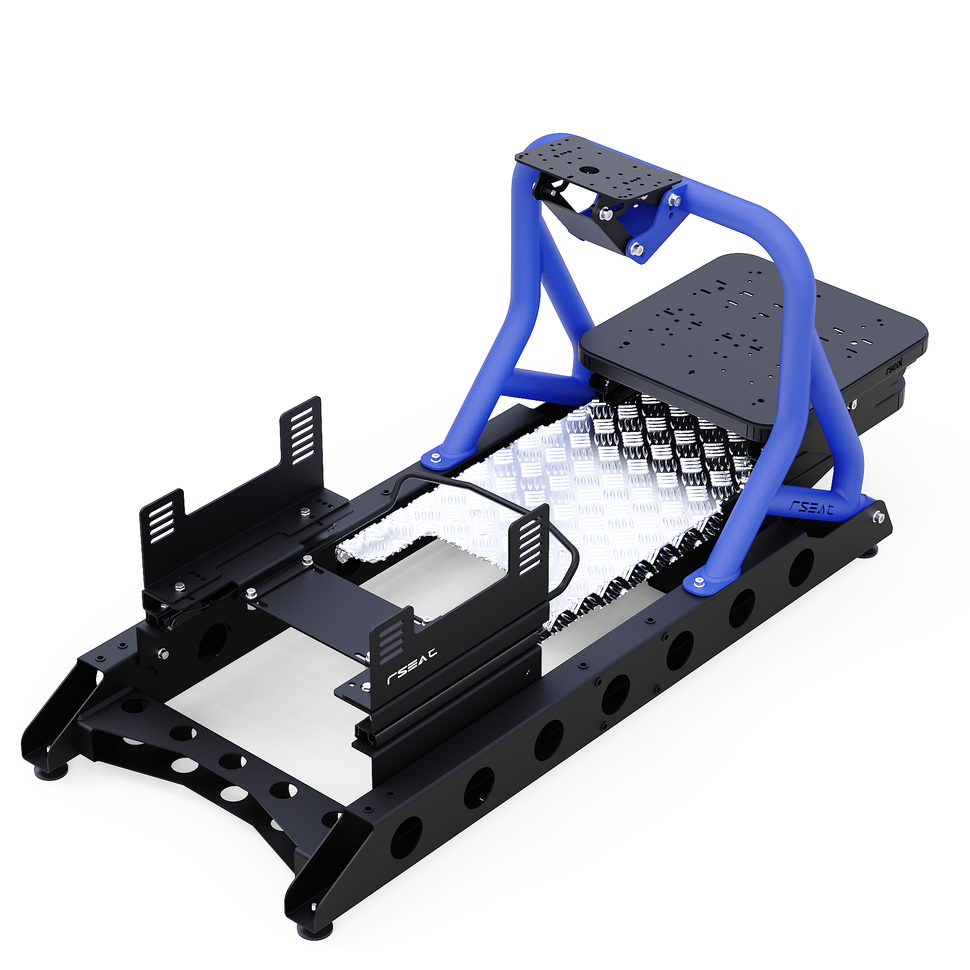 Our dedicated Front Mount wheelbase support (mounting points on the front side of the wheelbase) provides Ultimate Stability and Linear, Tilt, and Height adjustment in seconds. Support any High-End front mount wheelbase on the market, including Simucube, VRS, other MiGE Motor-type wheelbases, etc.… Quick Forward-Backwards adjustment via eight bolts. Detach the front mount wheelbase support and use the predrilled bottom mount. The assembly comprises thick Laser Cut carbon steel and a matte black powder coat finish. Zero-Flex guaranteed!
