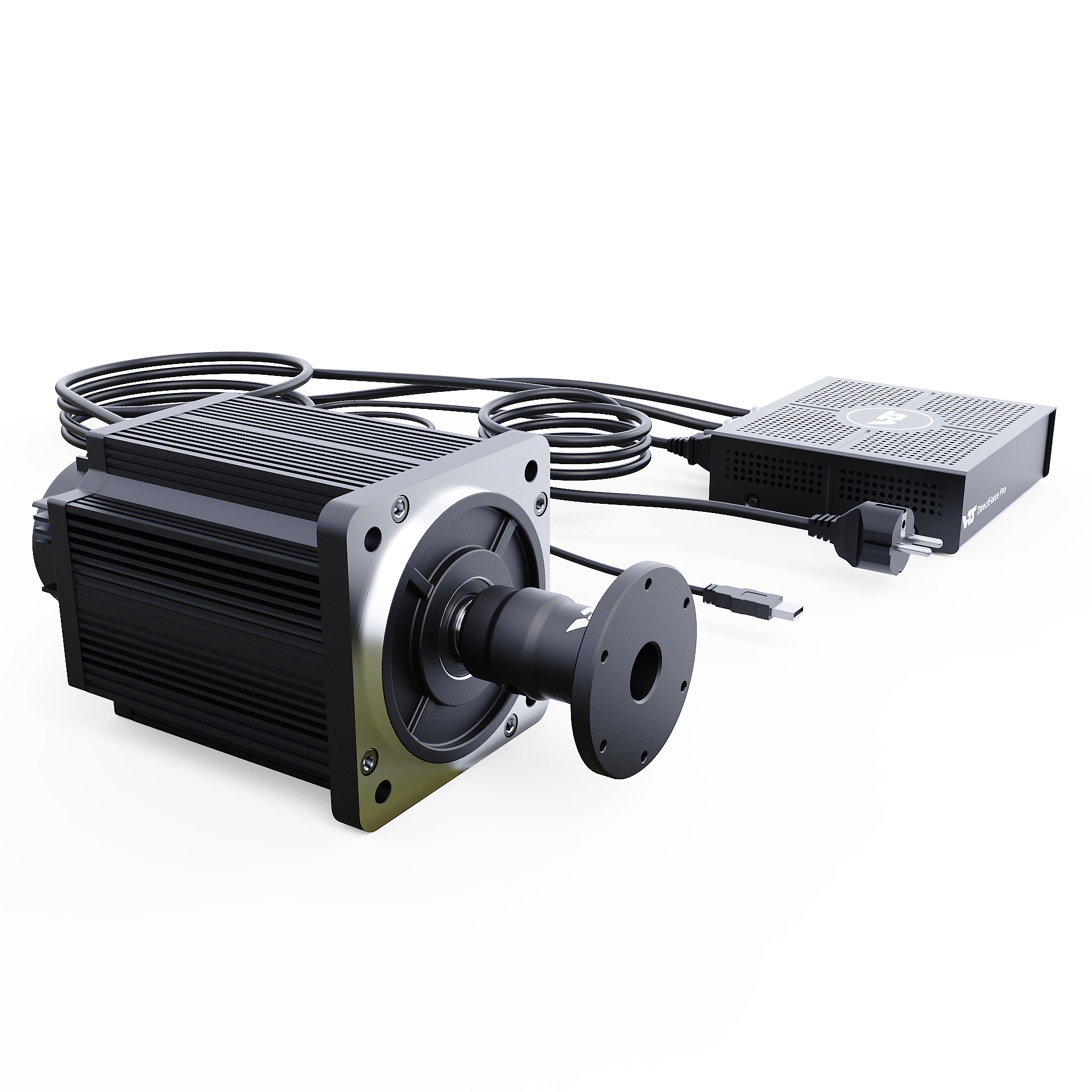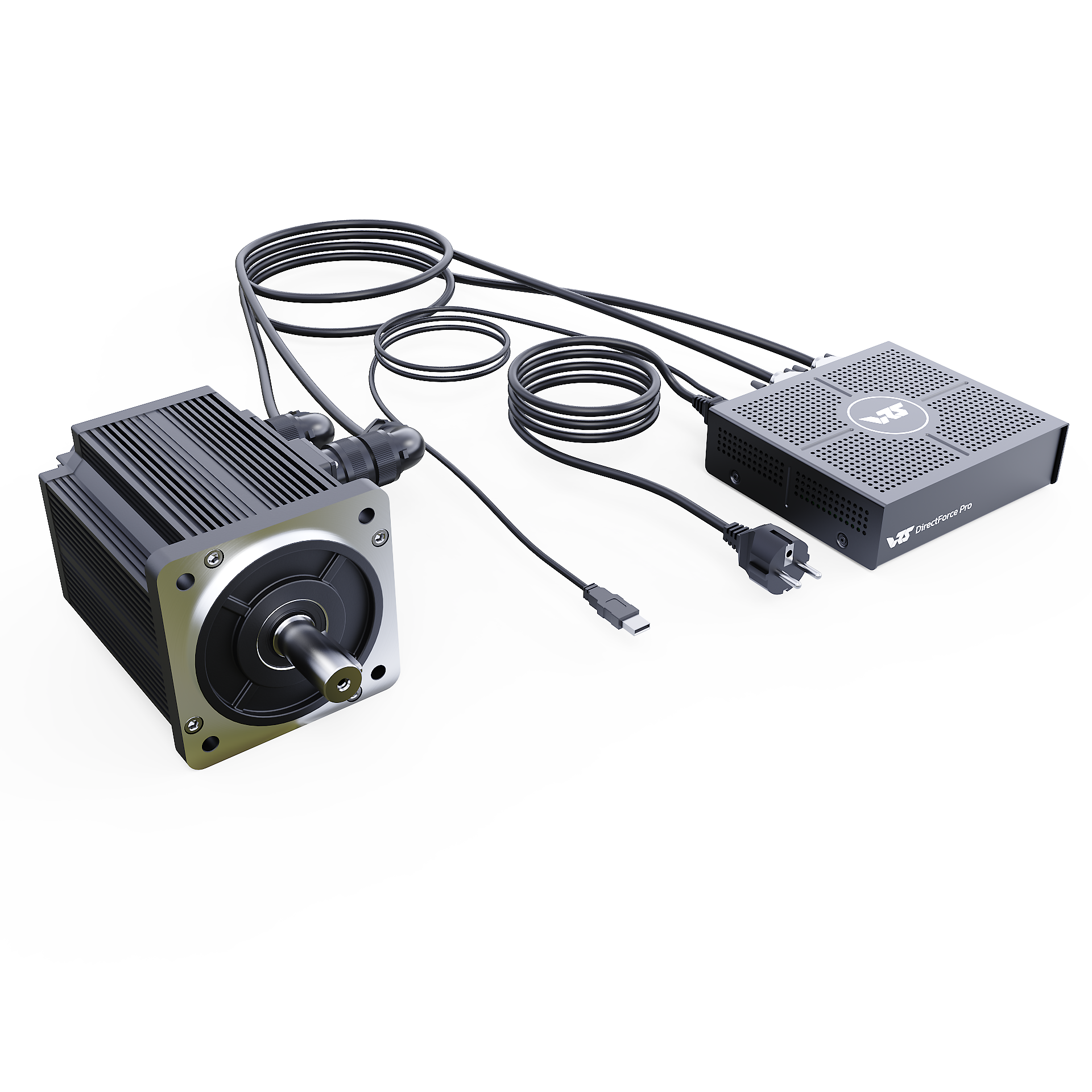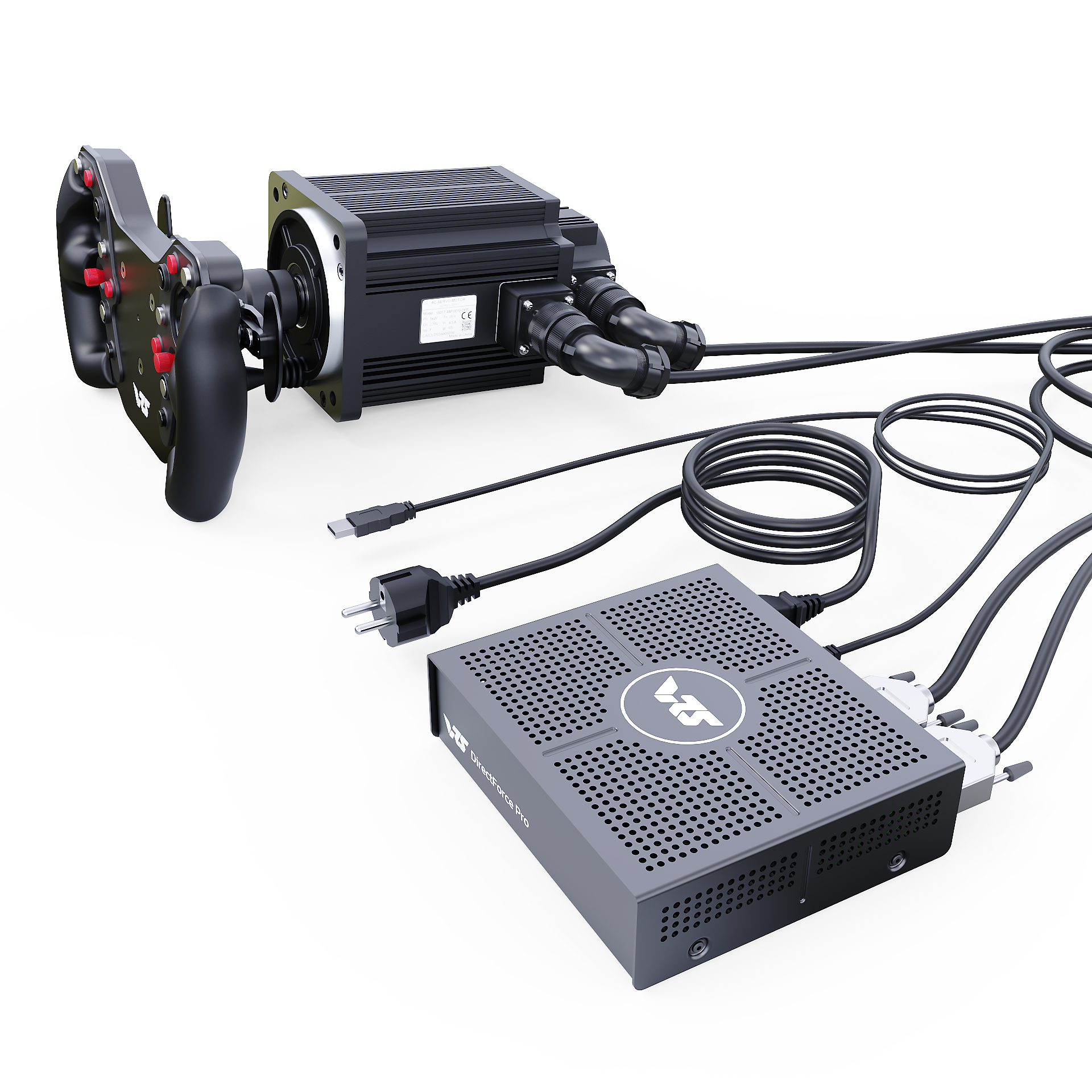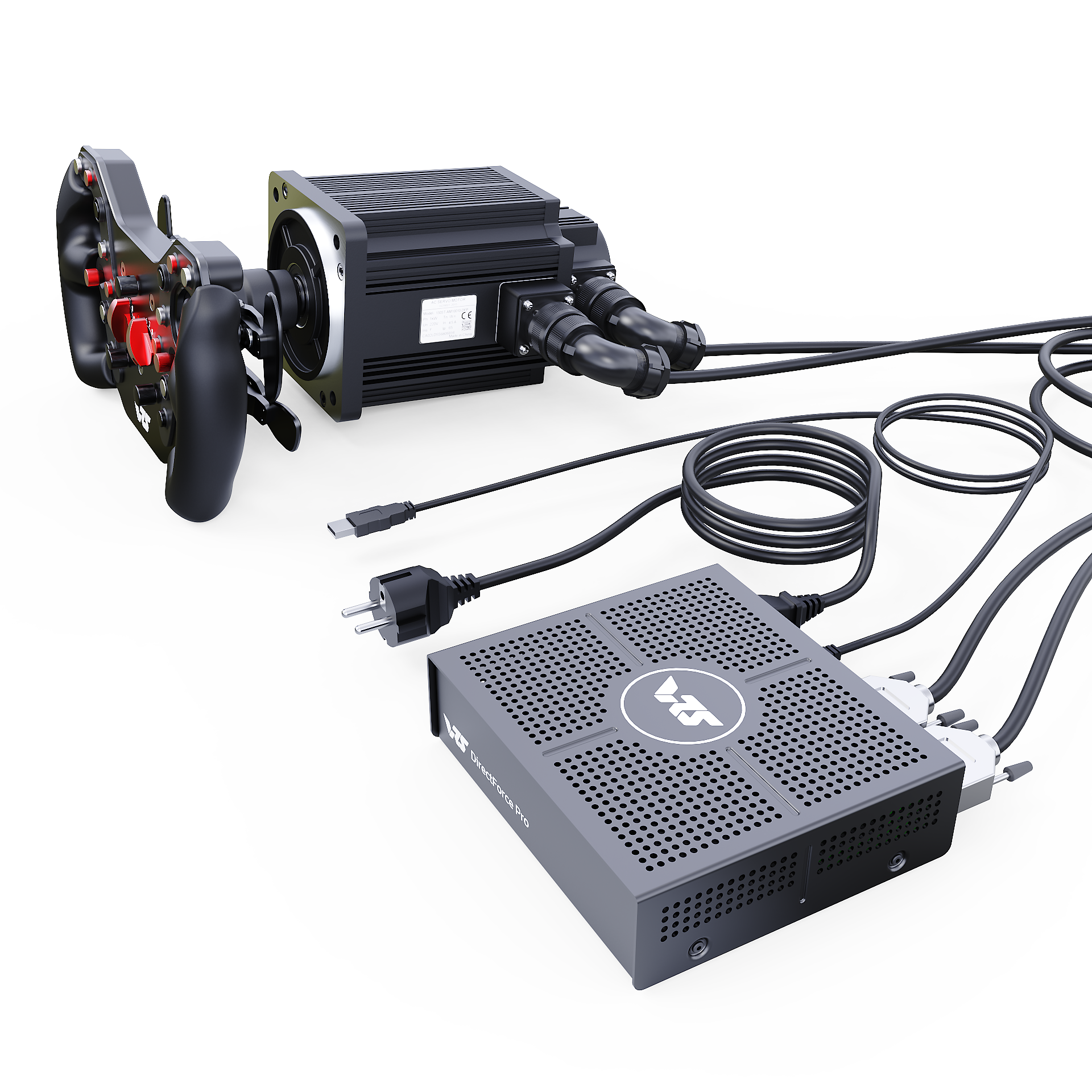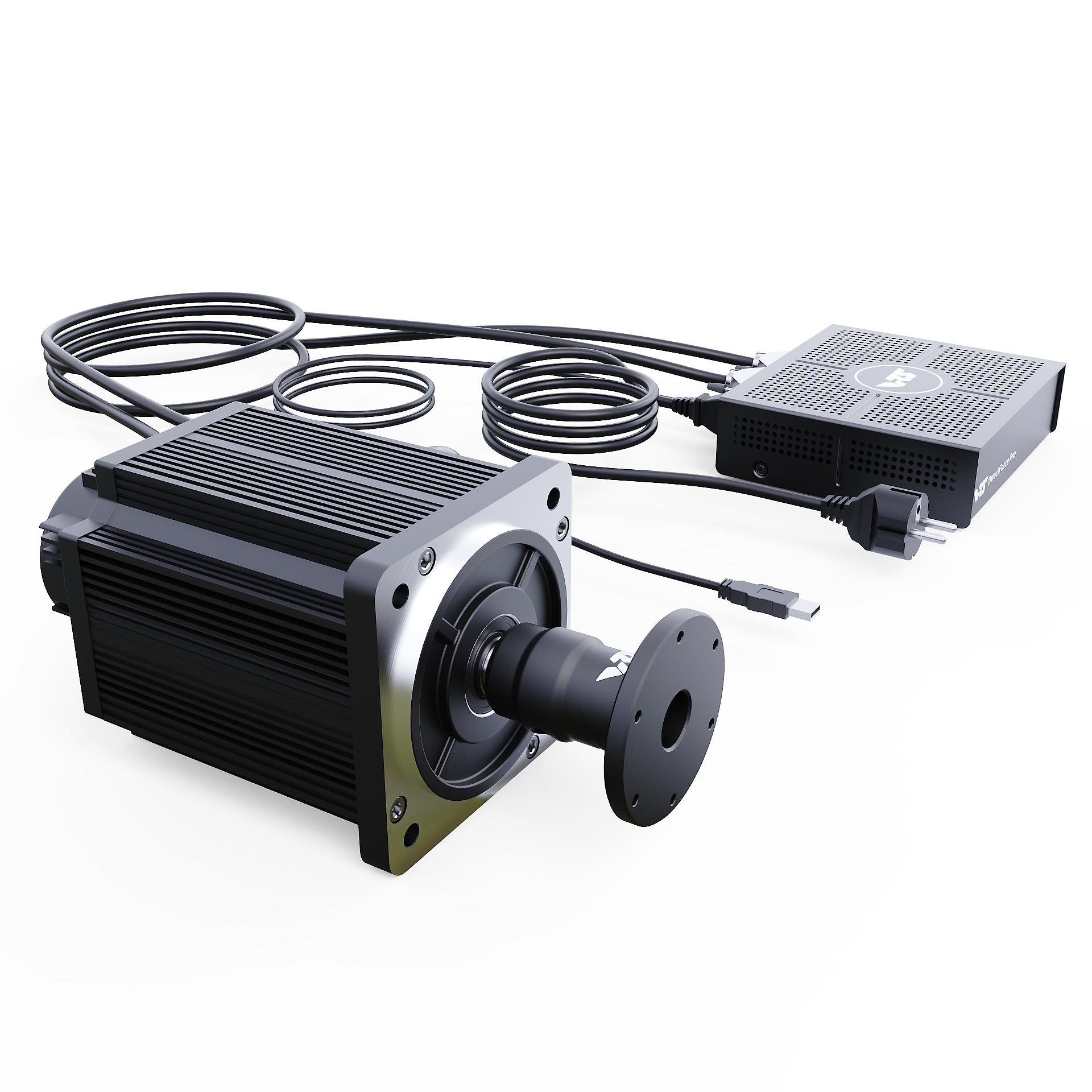 The VRS® DirectForce® Pro Wheel Base includes the VRS DirectForce Pro controller, a custom-engineered all-in-one USB FFB motor controller. It has a compact 5x16x18cm enclosure and a built-in 400W Mean Well PSU. The wheelbase features a 20Nm MiGE motor with a 22-bit BISS-C encoder customized for the VRS DirectForce Pro controller.