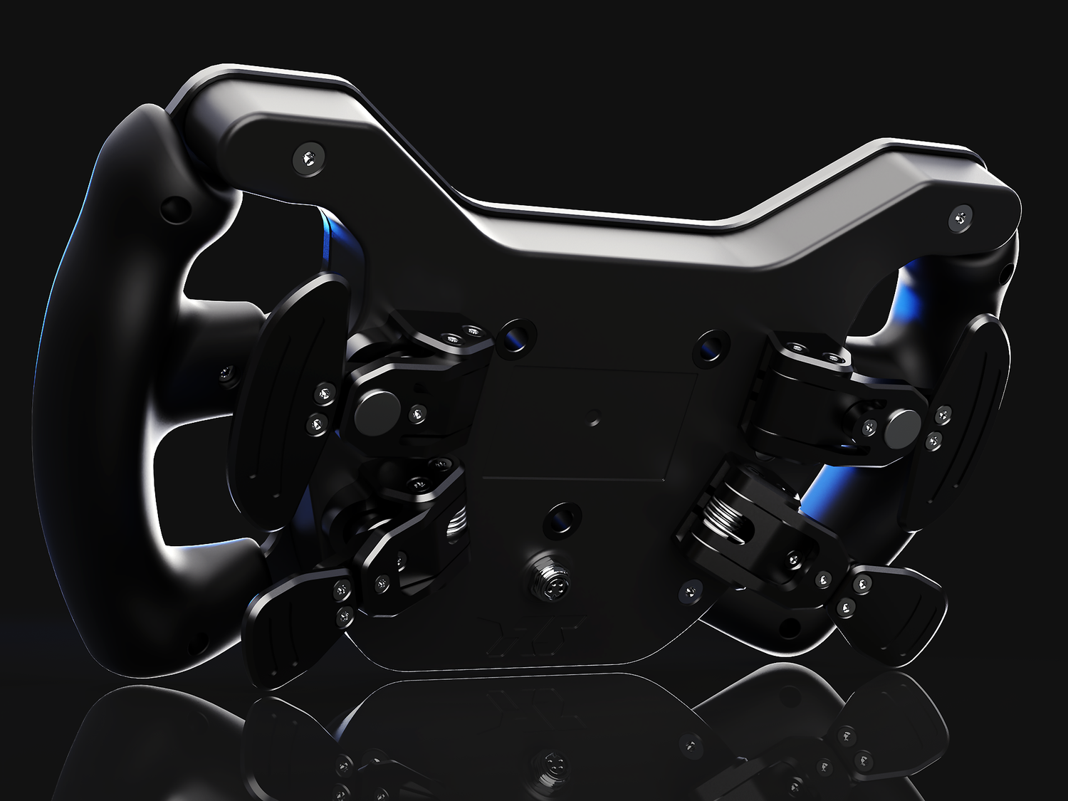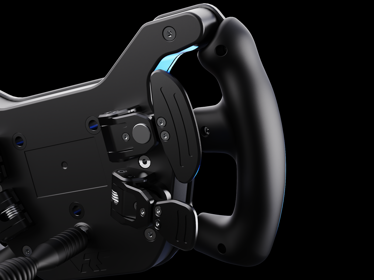 Constructed from light aluminium alloy, this wheel body is designed to be lightweight. It includes 2 Magnetic Shifter Paddles, 2 Dual Clutch Paddles, 14 Aluminium Buttons, 2 7-way Funky Switches, 3 Rotary Encoders, and 3 12 Pos. Switches. The setup includes shift and clutch paddles equipped with Hall sensors. For rapid shifting, the shift paddles also incorporate magnets. Fully customizable clutch bite points.